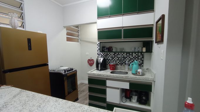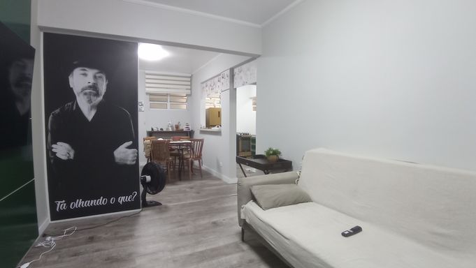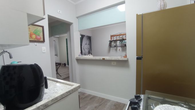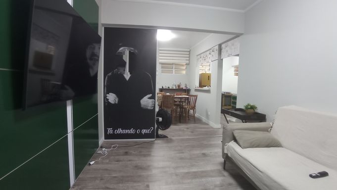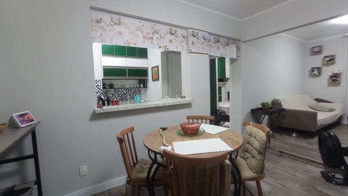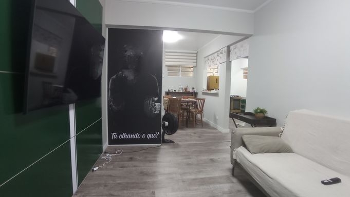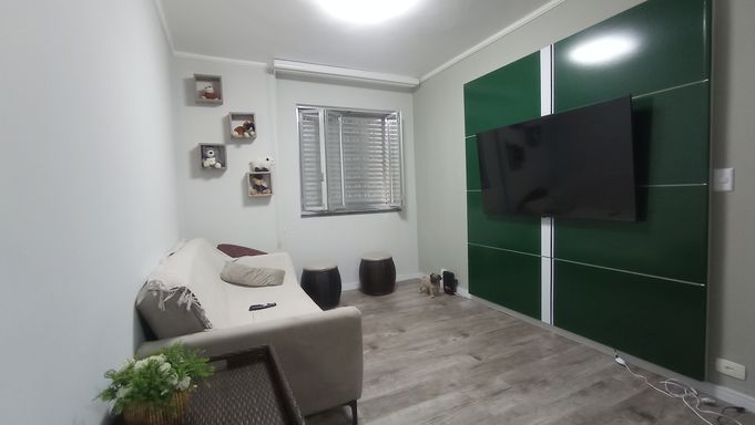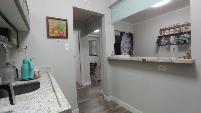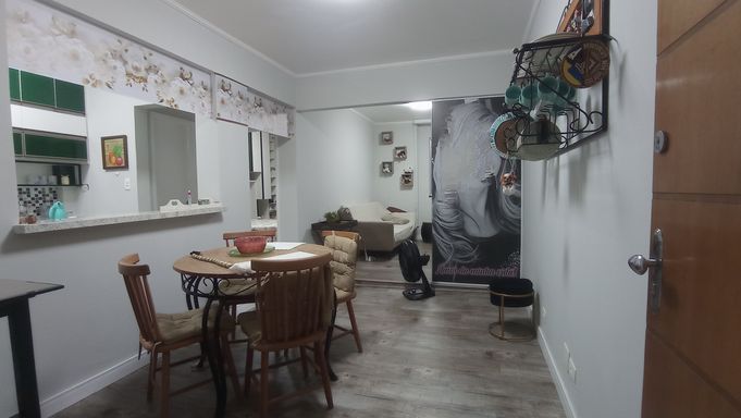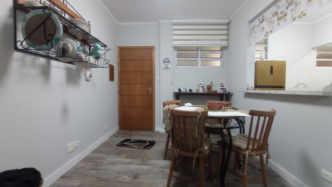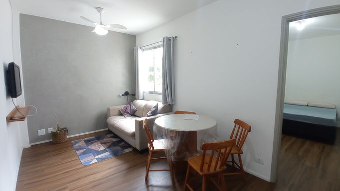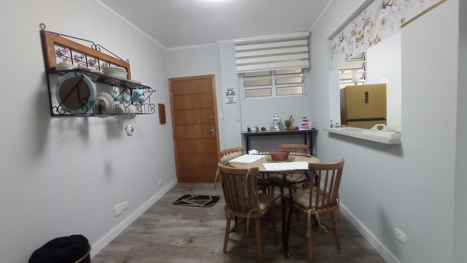 Apartamento de 42 mts, reformado, 01 dormitório, sala de estar e sala de TV, cozinha americana, WC Social e área de serviço.