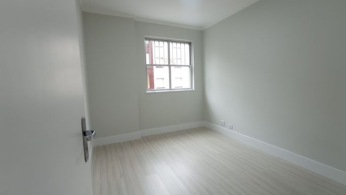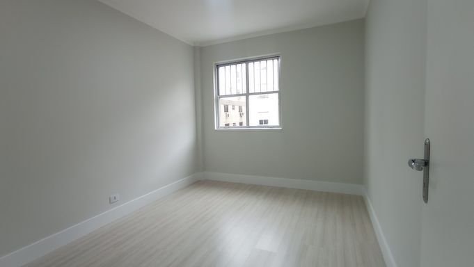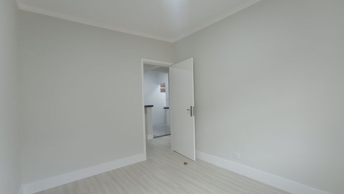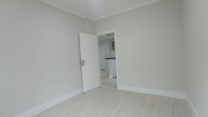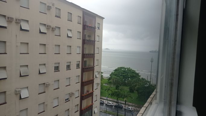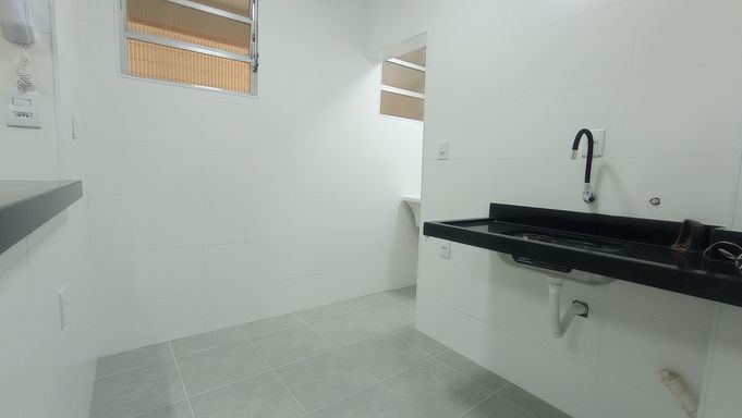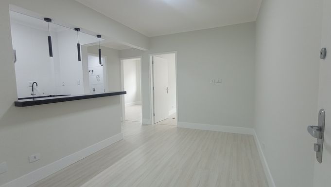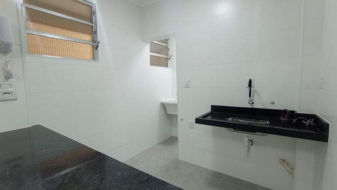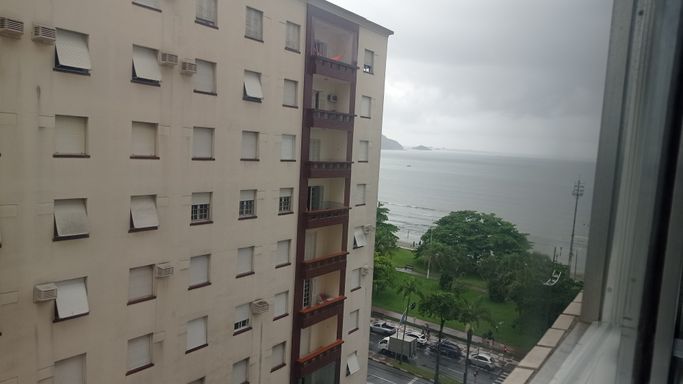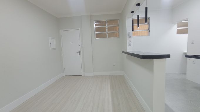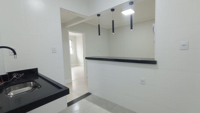 Apartamento de 02 dormitórios, reformado, com banheiro social, cozinha americana, área de serviço e vista lateral para o mar dos dormitórios.