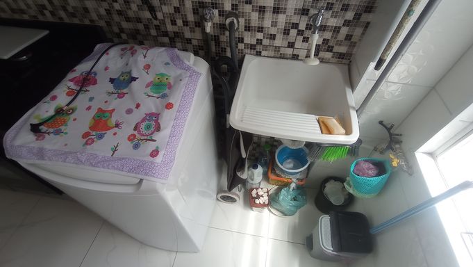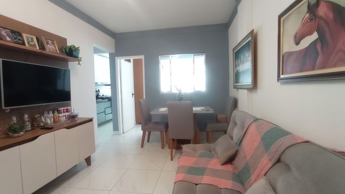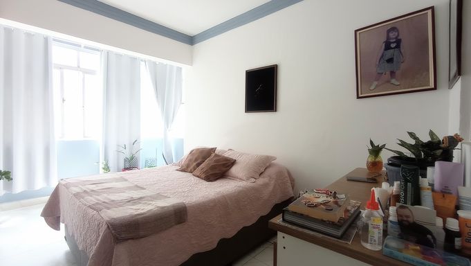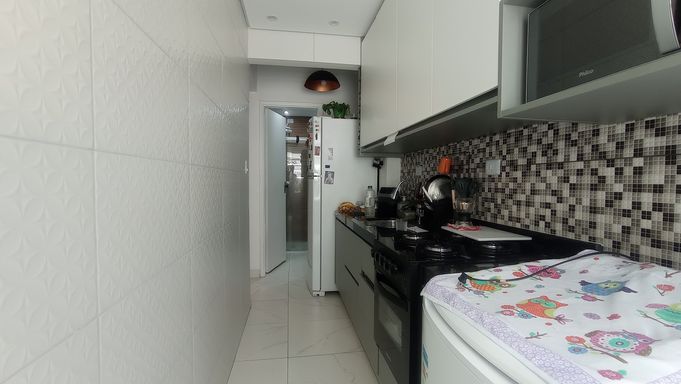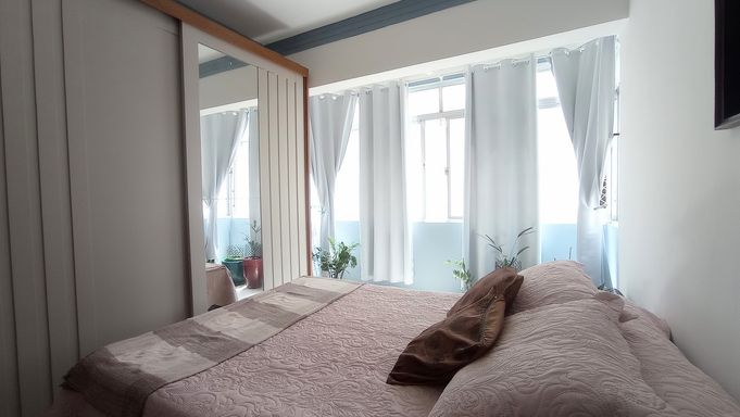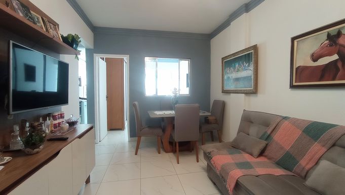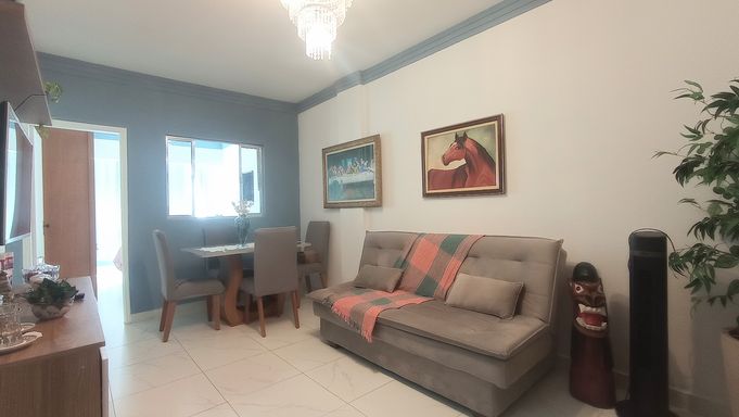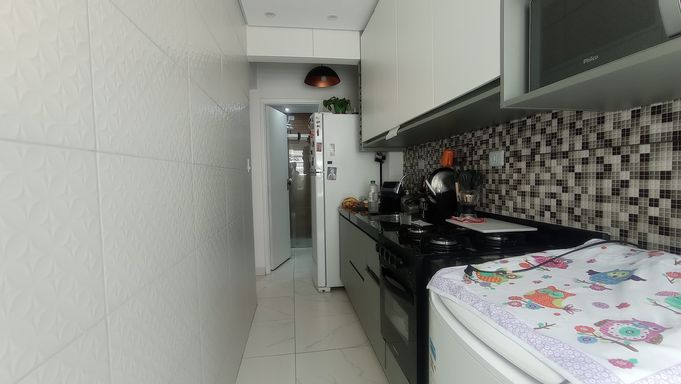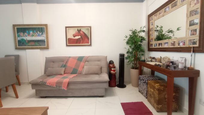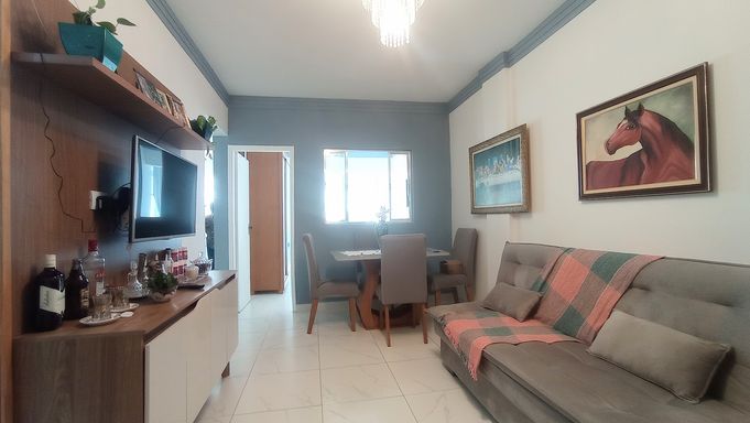 Sala Living com 48m², reformada, dividida em quarto e sala, varanda integrada, lavabo, WC social, cozinha com área de serviço, fechadura digital e 01 vaga de garagem coletiva com manobrista.