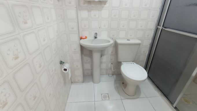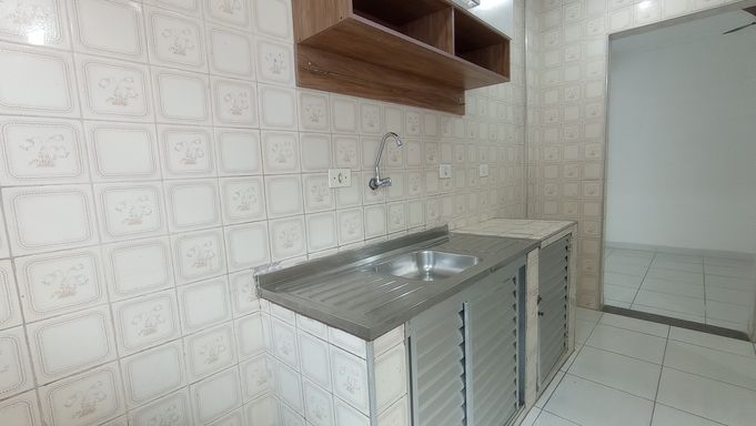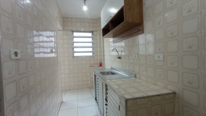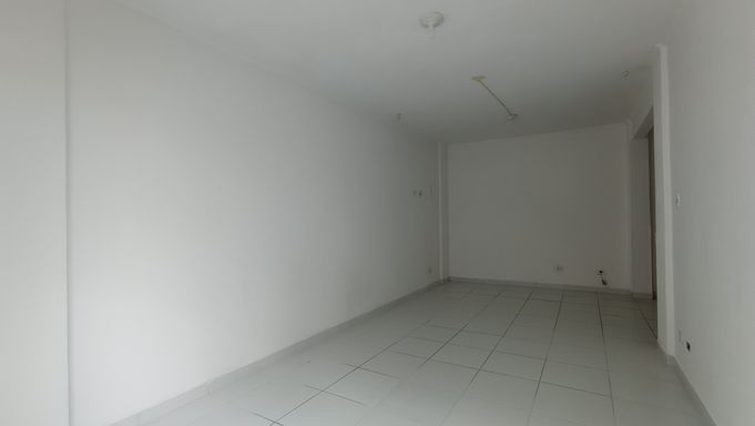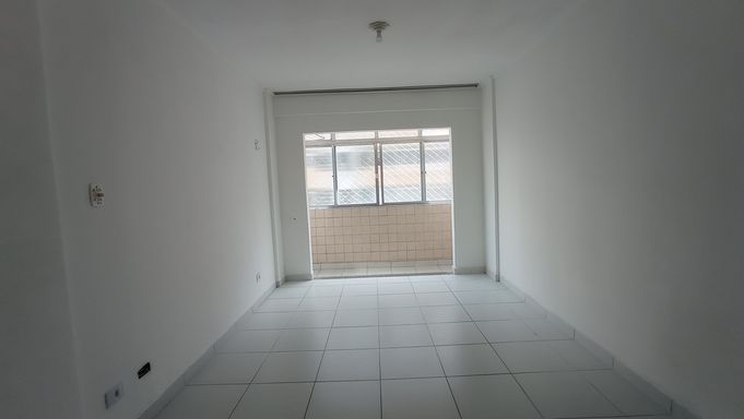 Sala living de 45m² com sala grande em L integrada com varanda, WC social, cozinha e área de serviço.
